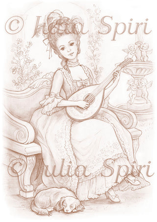 Grayscale Coloring Page. Lady with Rococo Dress Playing Music with Lute. Versailles Afternoon