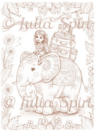 Grayscale Coloring Page. A girl travels on an elephant in a tropical forest. Where Dreams Begin to Travel