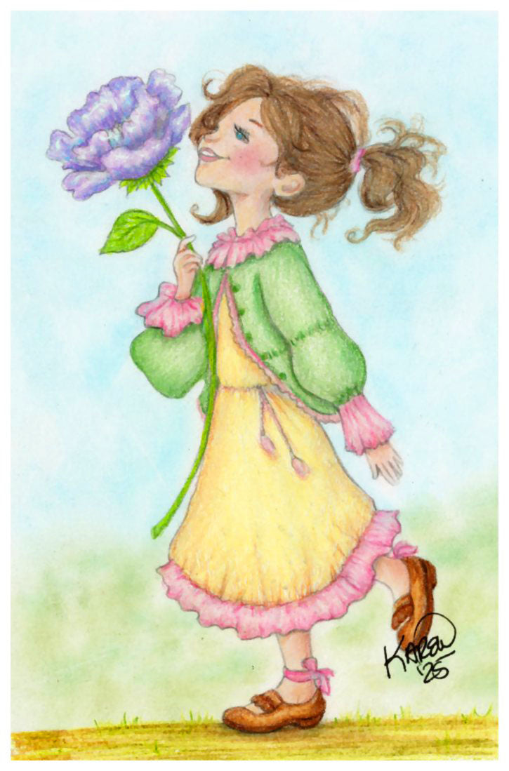 Grayscale Coloring Page, Little Girl with Flower. Blooming Joy