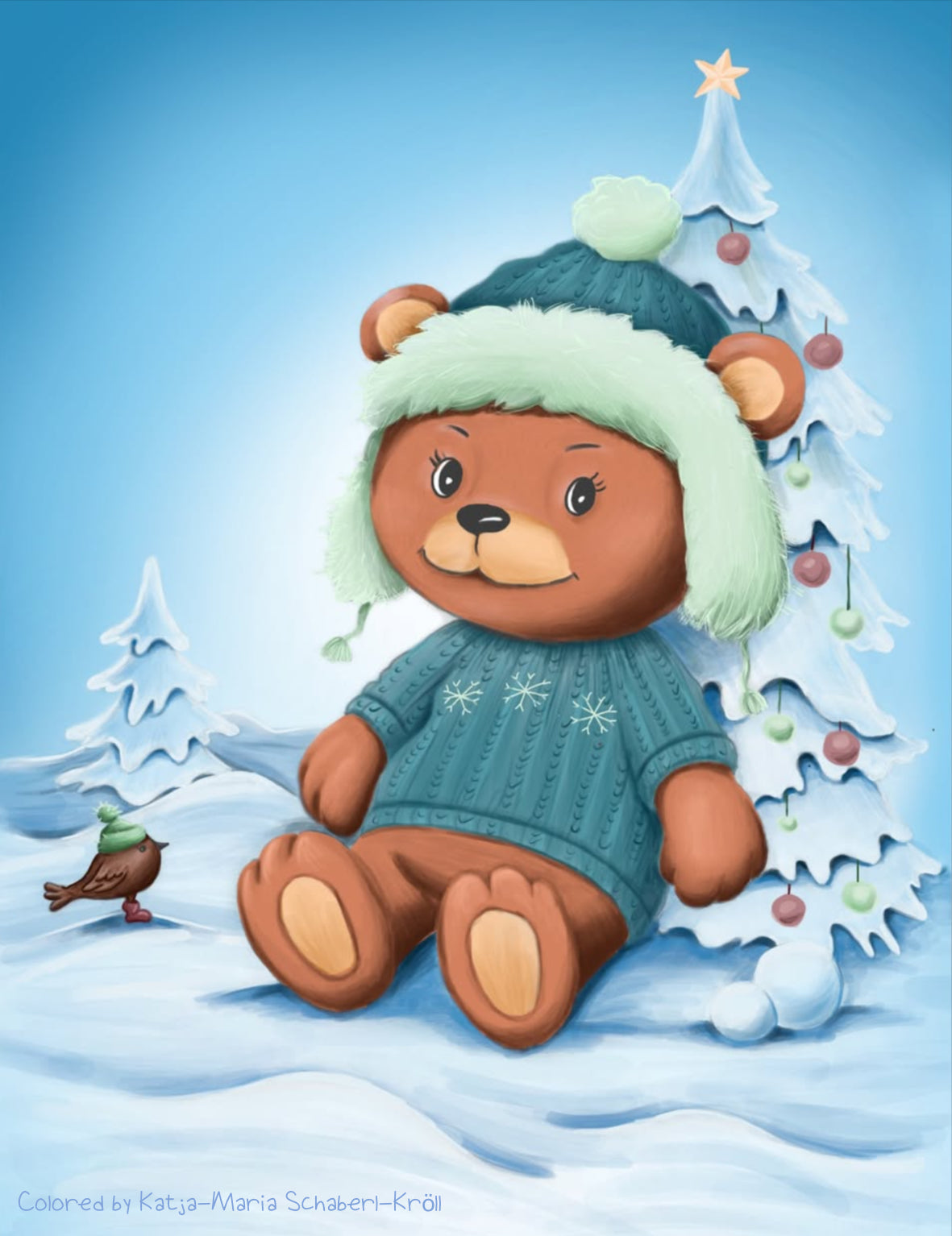 Coloring Page, Cute Bear in Snow Winter. Teddy Wally