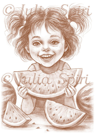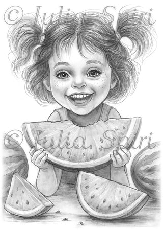 Grayscale Coloring Page. Smiling Girl with Watermelon. A Bite of Summer