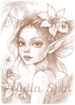 Grayscale Coloring Page. Whimsy Elf with Insect on Tropics. Elf of the Emerald Tropics