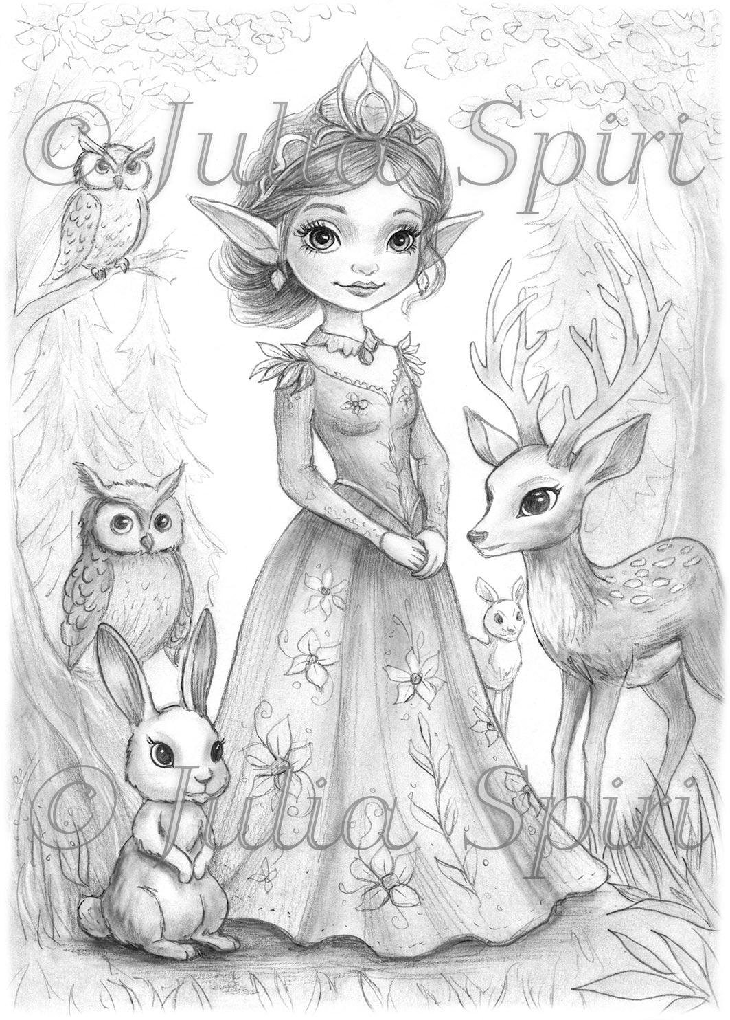 Grayscale Coloring Page, Elf with Forest Animals. The Queen Elf and Her Woodland Family