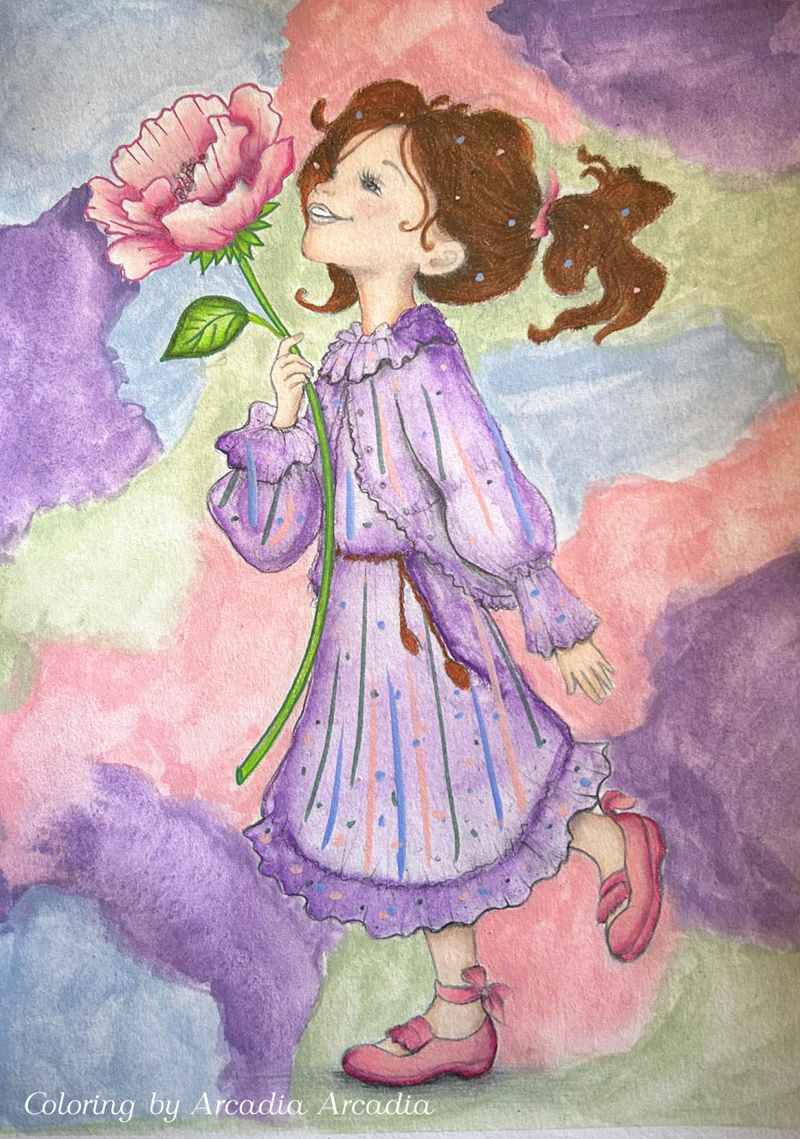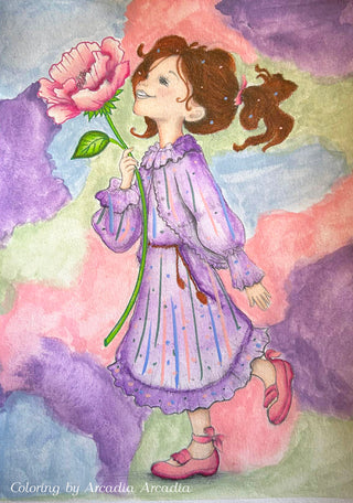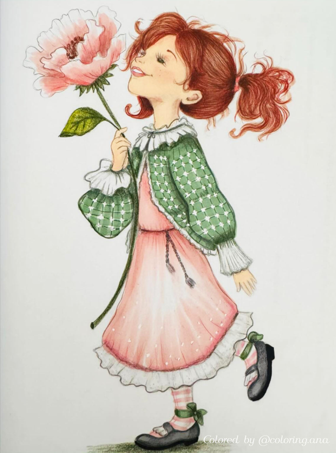 Grayscale Coloring Page, Little Girl with Flower. Blooming Joy