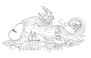 Coloring Page, Fantasy Hairstyle with Ships. Sea and Hair