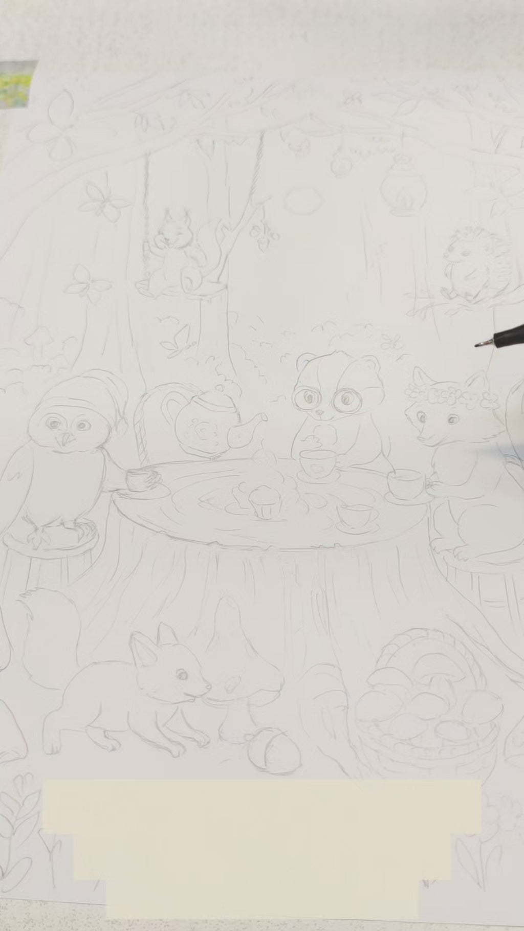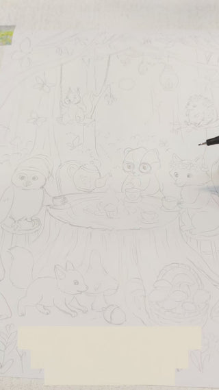Grayscale Coloring Page. Owl, Raccoon, Fox, Squirrel, Hedgehog at the Forest Tea Party. Magical Woodland Picnic
