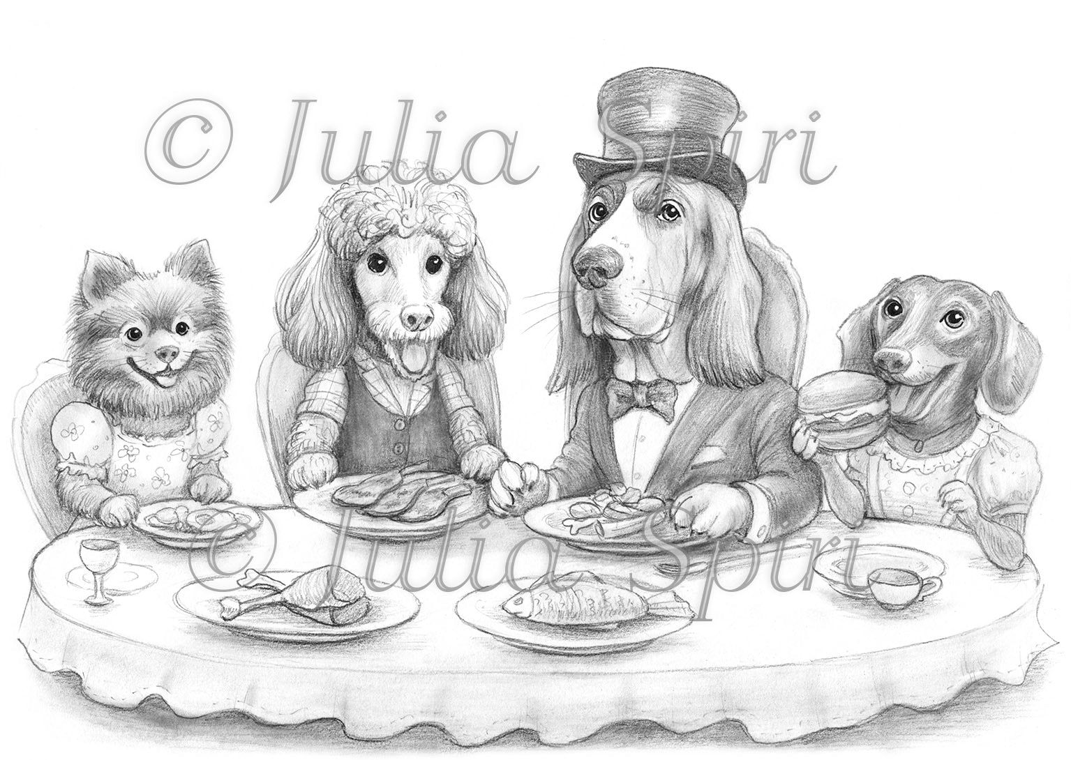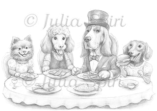 Grayscale Coloring Page, Fun Dogs Eating at the Table. The Aristodogs Banquet