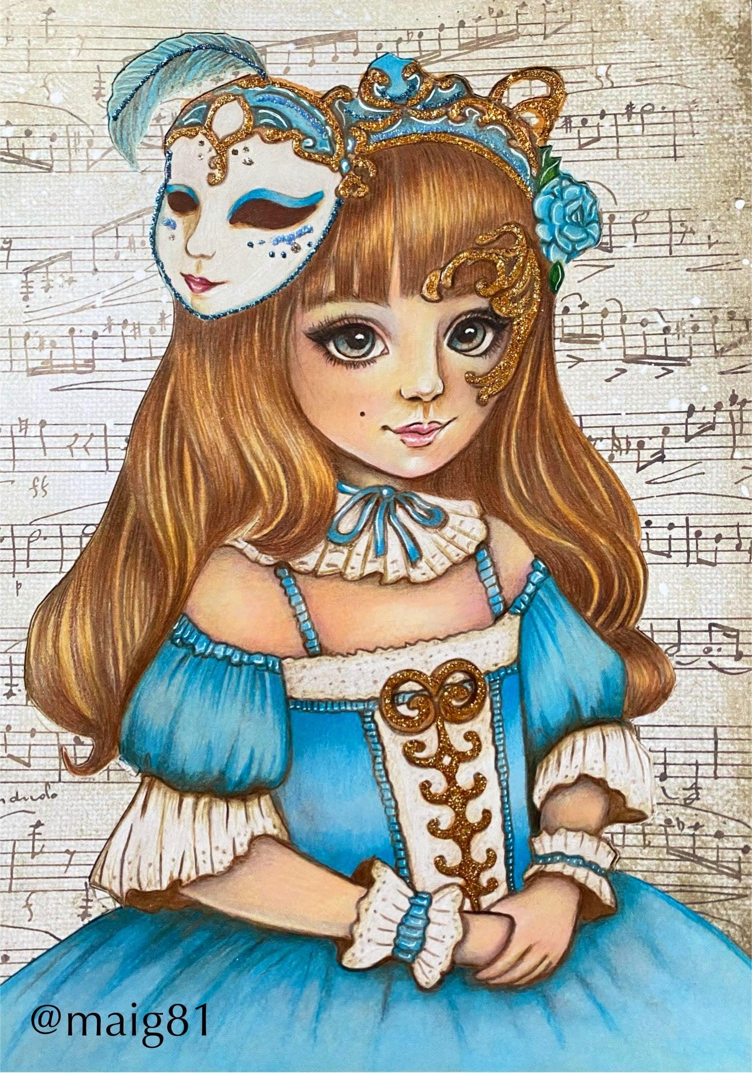 Grayscale Coloring Page, Girl with Mask in Venice. Venetian Reverie