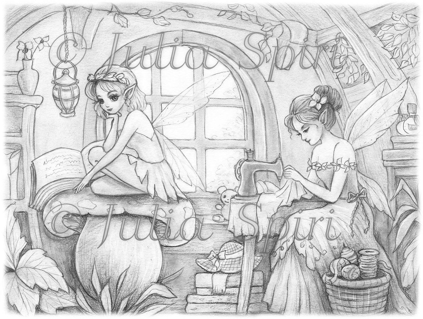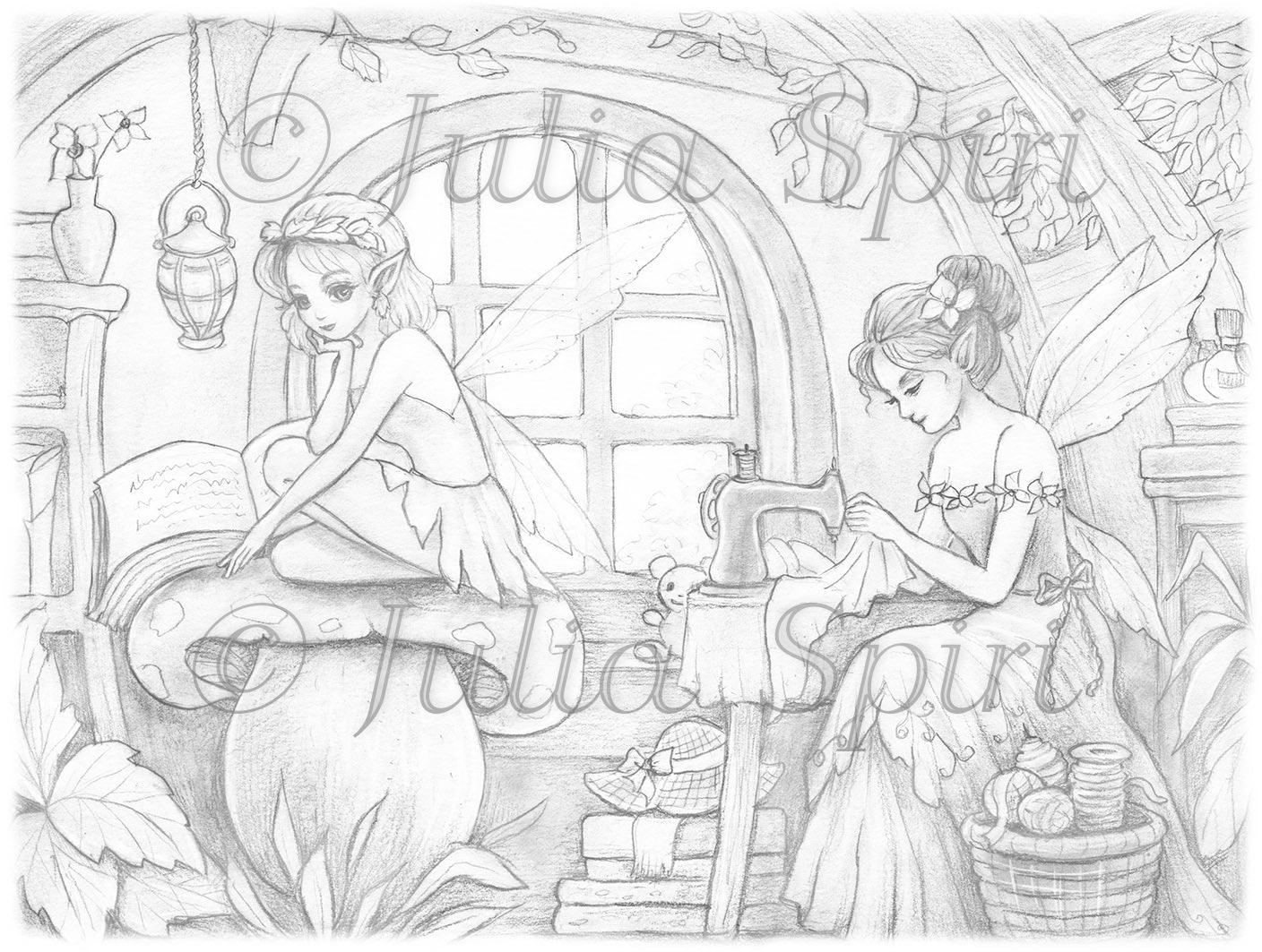 Grayscale Coloring Page, Fairy Tale Fairies. Tinker Bell’s Sisters Sweet Home