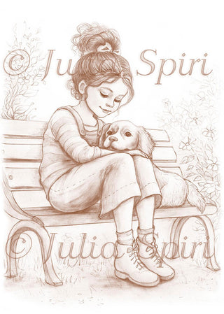 Grayscale Coloring Page, Girl with Dog. Best Friends Forever