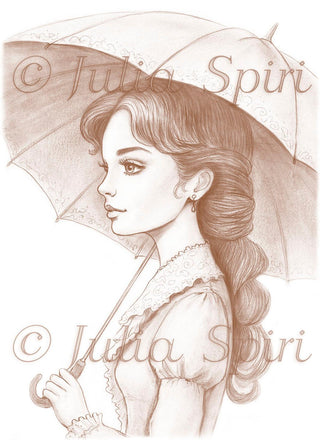 Grayscale Coloring Page, Fantasy Girl. Enchanting Rainfall