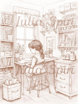 Grayscale Coloring Page, Girl in Crafting Room. The Crafting Corner