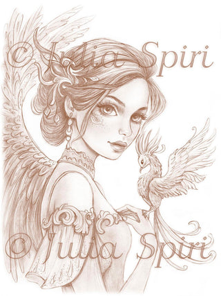 Grayscale Coloring Page, Fairy Tale. The Phoenix Keeper Fairy