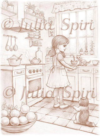 Grayscale Coloring Page, Little Girl and Cats. Tiny Chef in the Kitchen