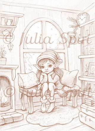 Grayscale Coloring Page, Whimsy Winter Elf in Cozy Home. Winter Mood