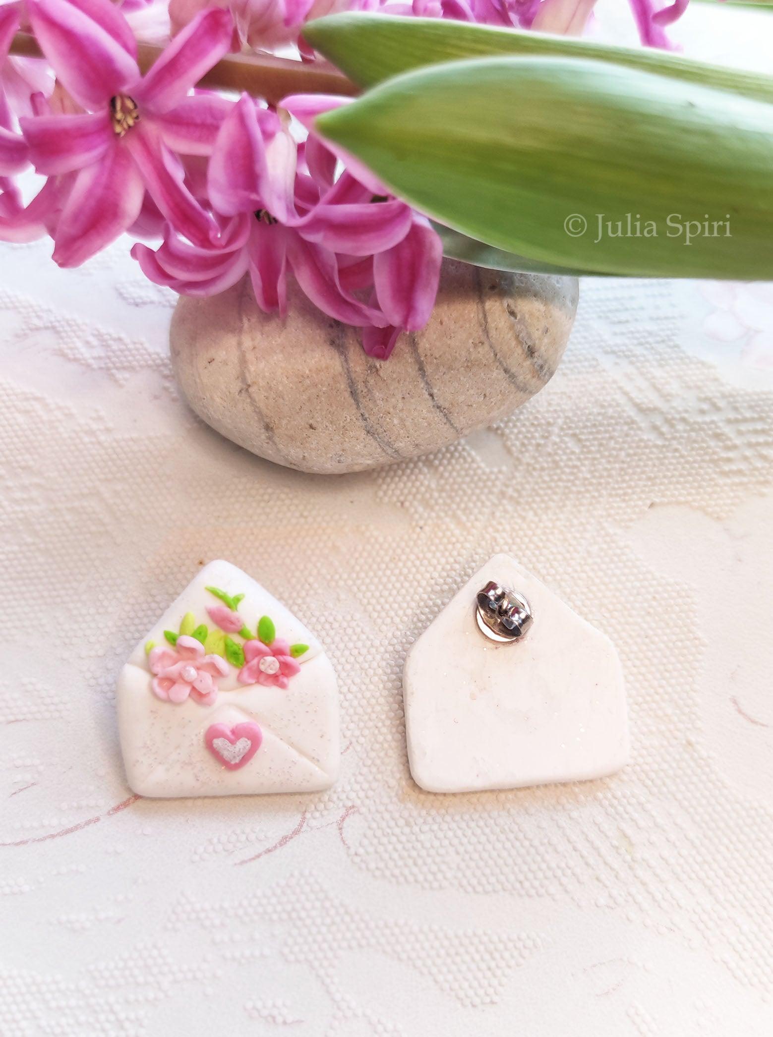 Handmade Polymer Clay Earrings: "Romantic Envelopes" made entirely by hand with a lot of love. Polymer clay is kiln-fired at 130ºC, and then it becomes a very resistant material, so the flowers will not break.