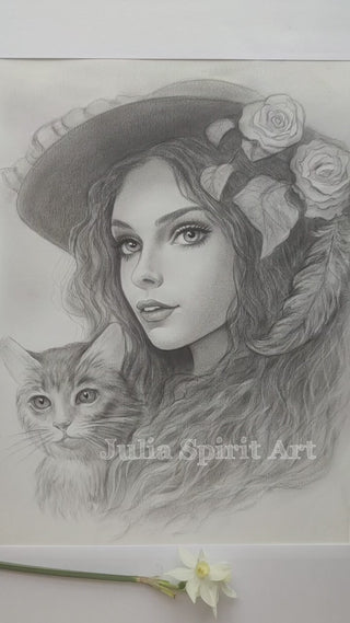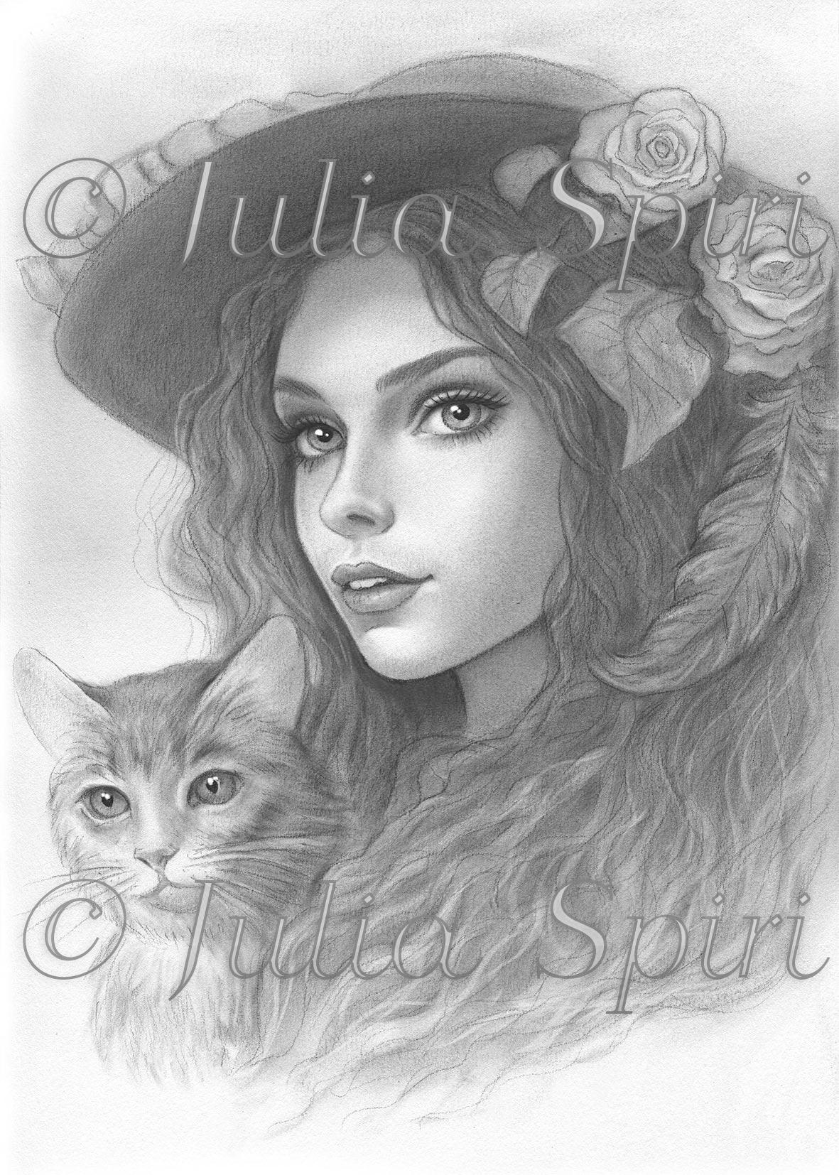 Grayscale Coloring Page, Fantasy Portrait of Girl with Flowers. Gabriela and Cat