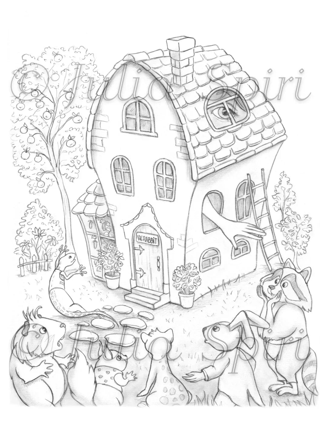 Coloring Page, Alice in Wonderland Creatures, Lizard, Whimsy Home. White Rabbit's House