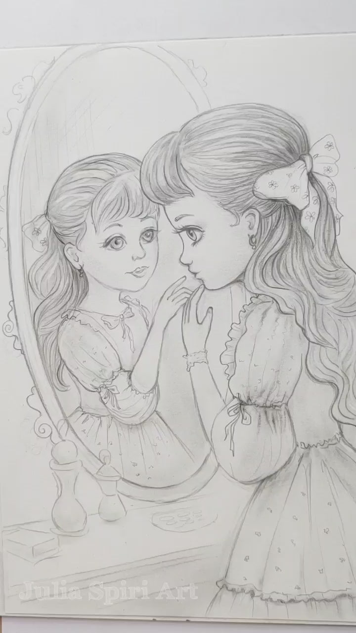 Grayscale Coloring Page, Cute Girl looking in the mirror. Reflection