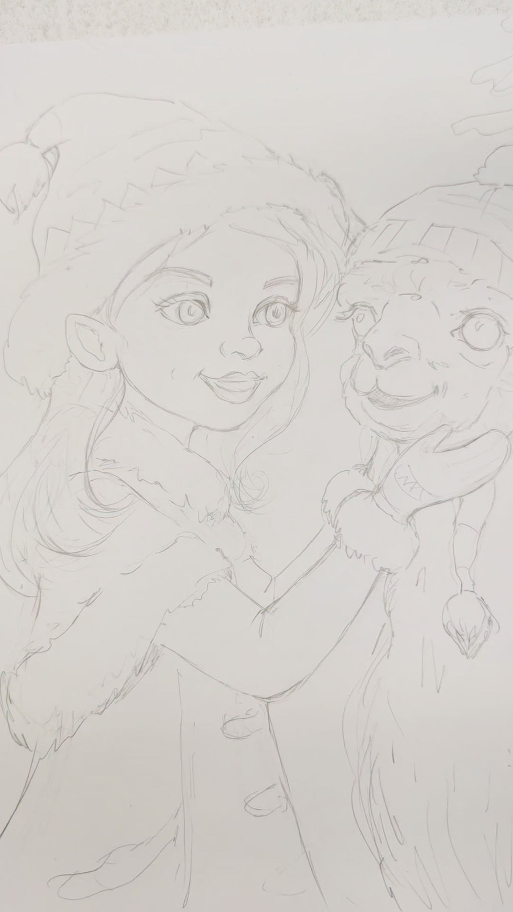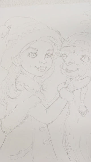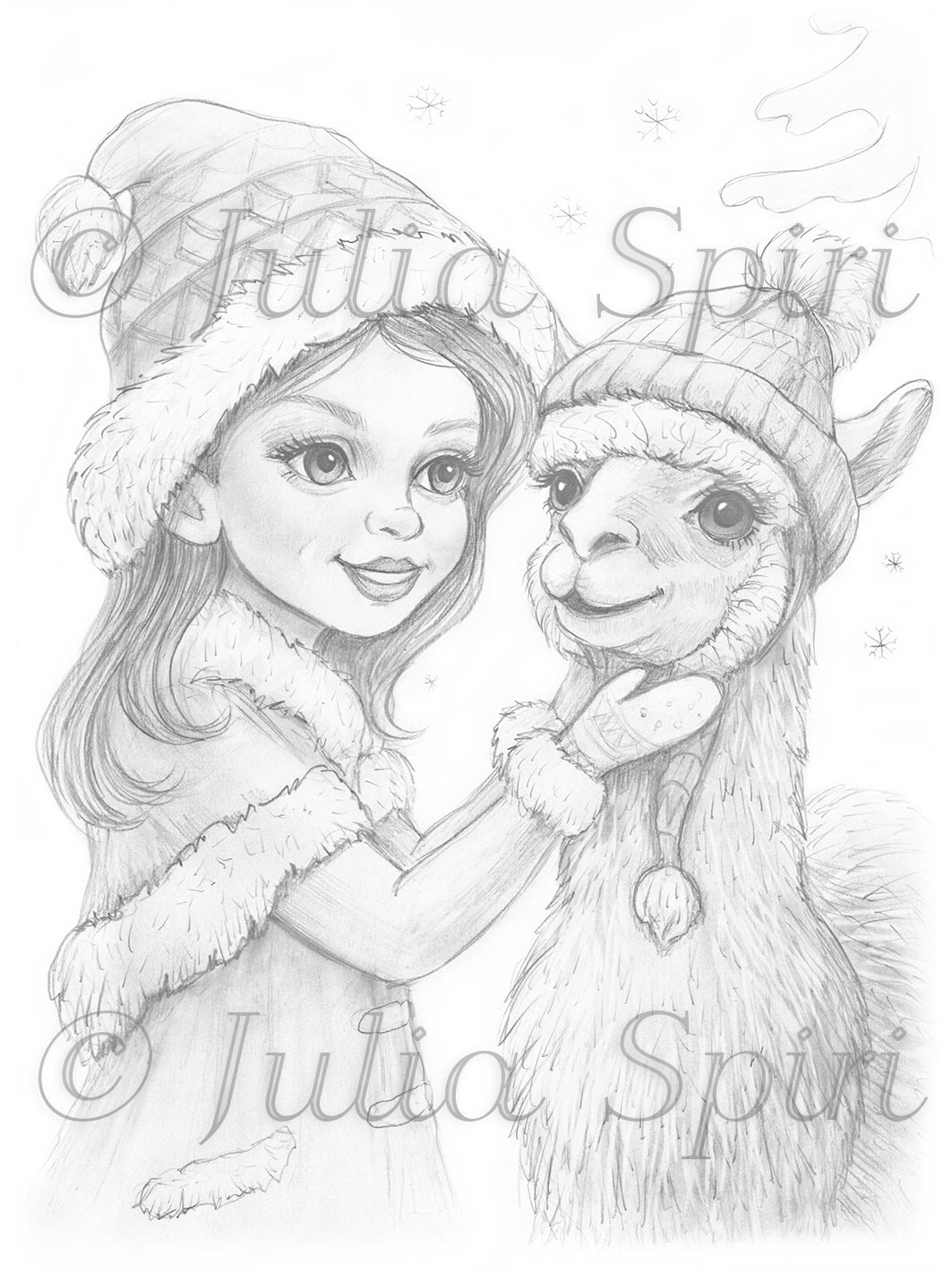 Grayscale Coloring Page. Winter Girl and the Cozy Llama