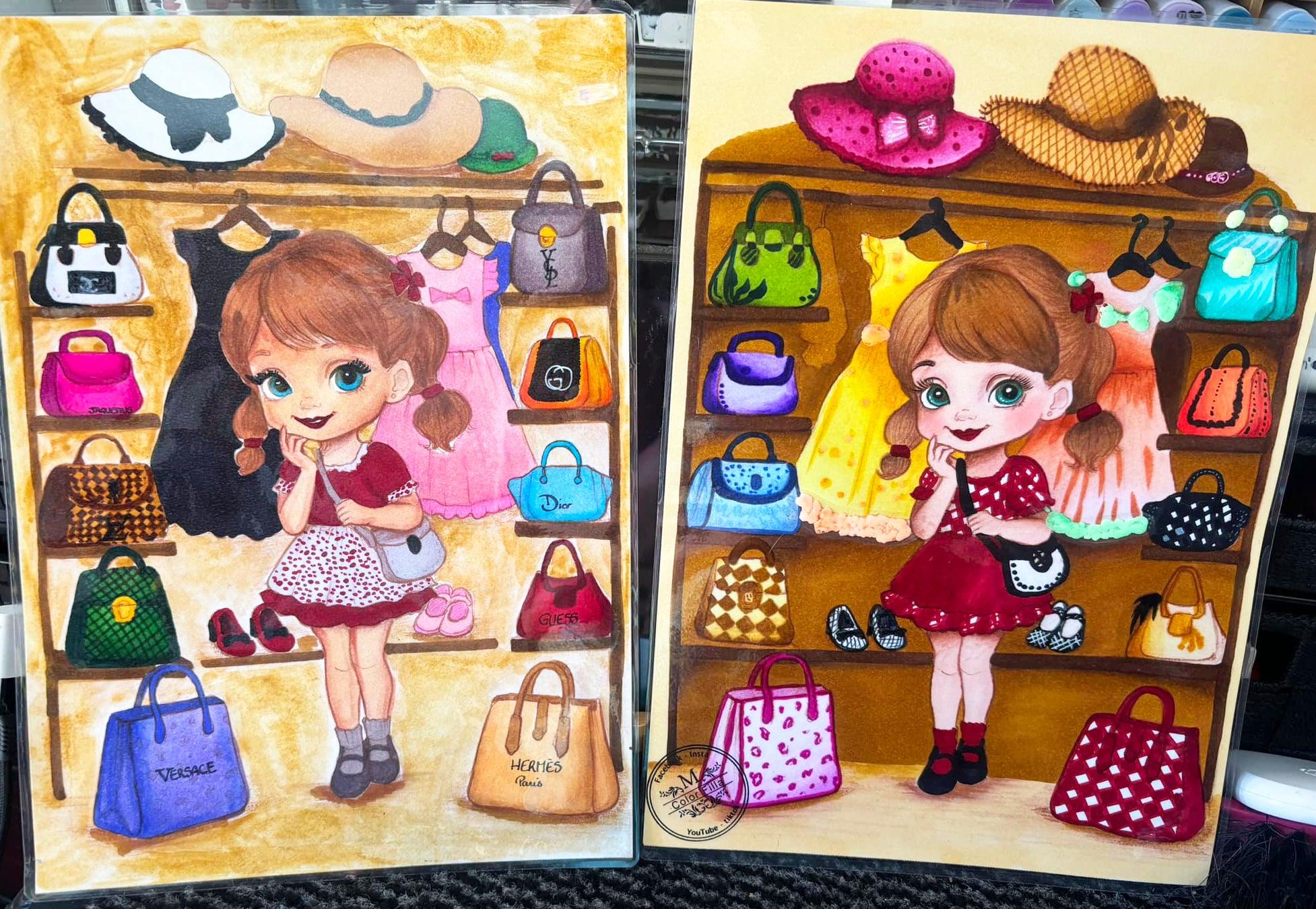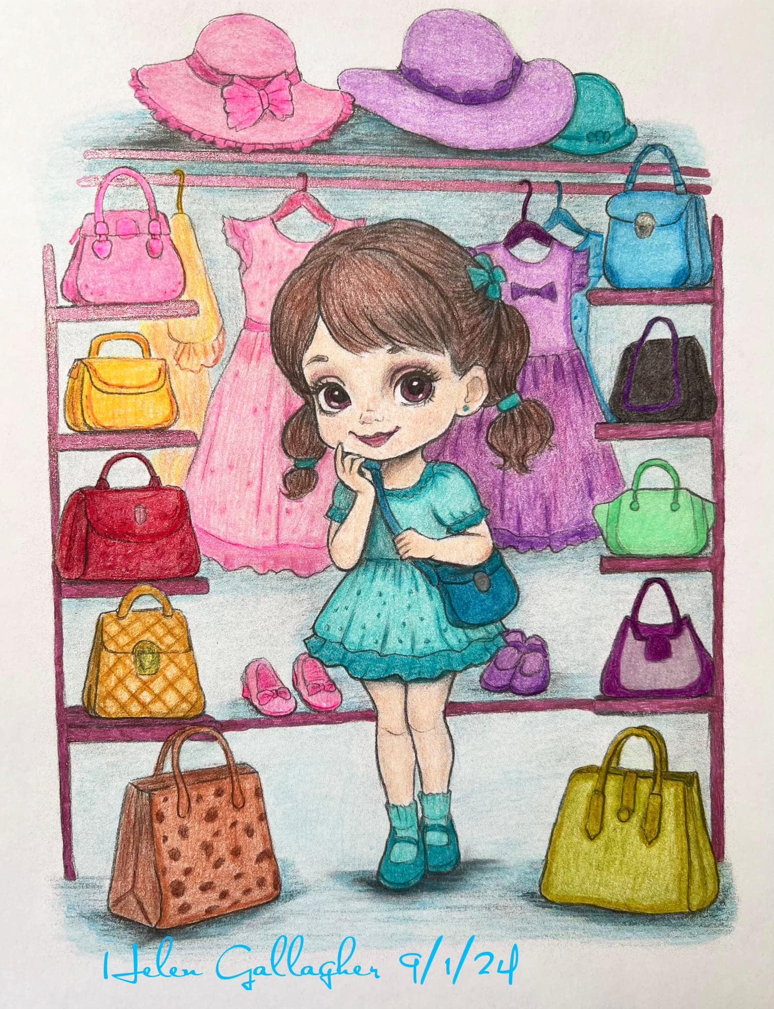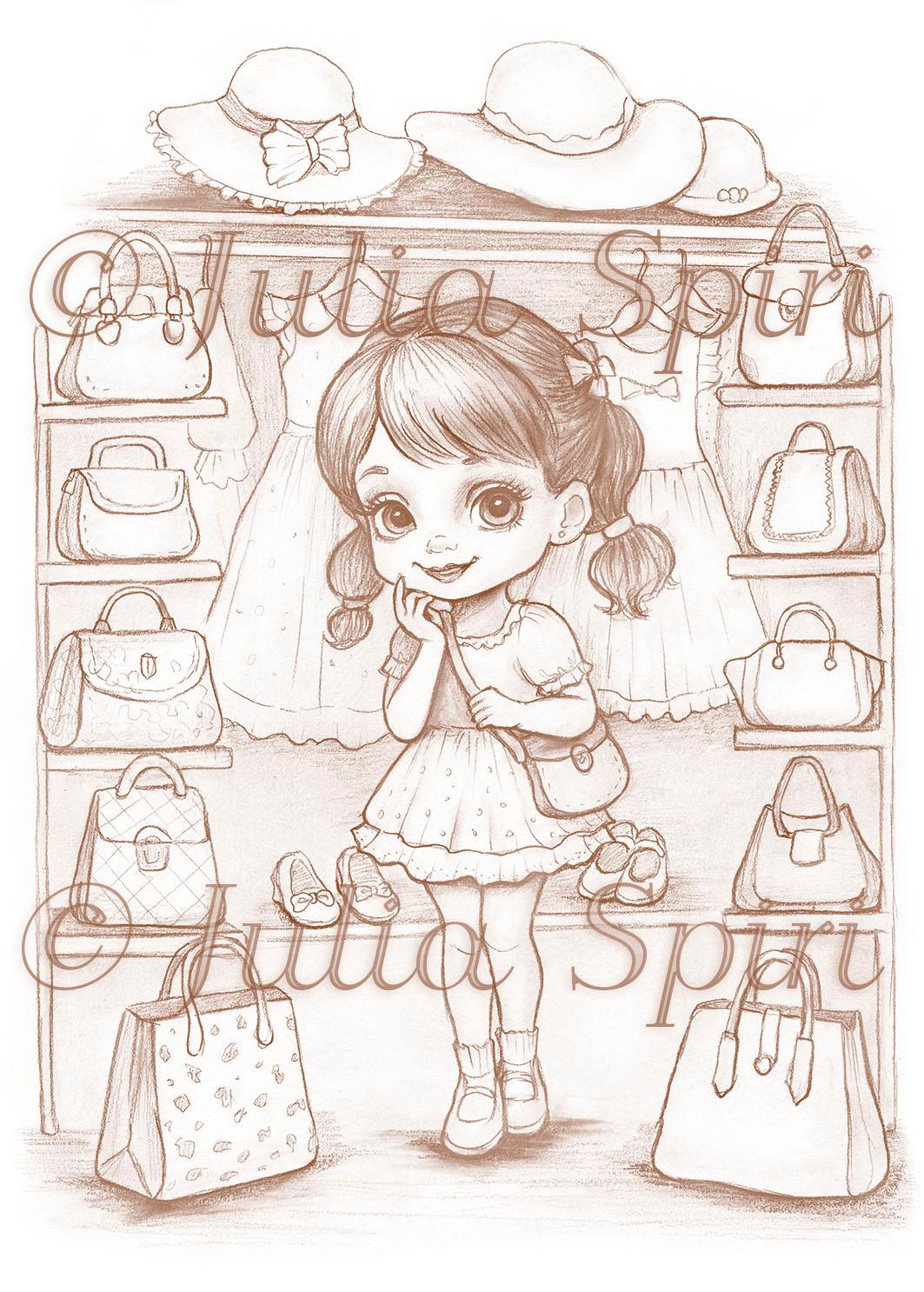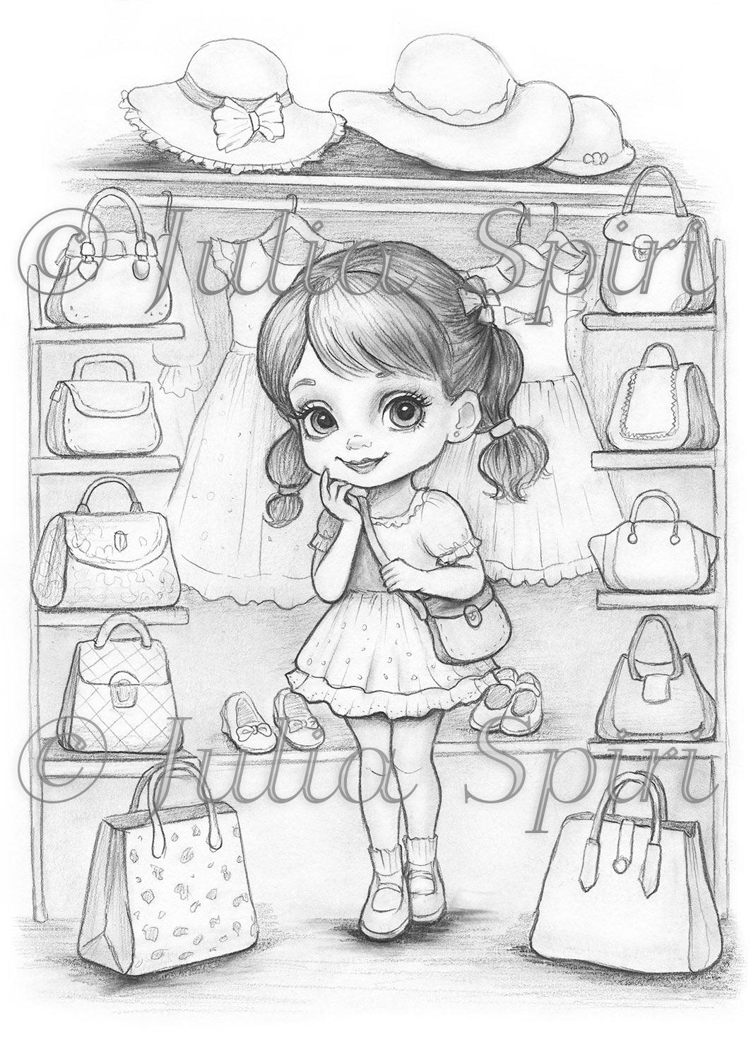 Grayscale Coloring Page, Little Girl and her Closet. Coquette's Dilemma: Picking the Ideal Bag.