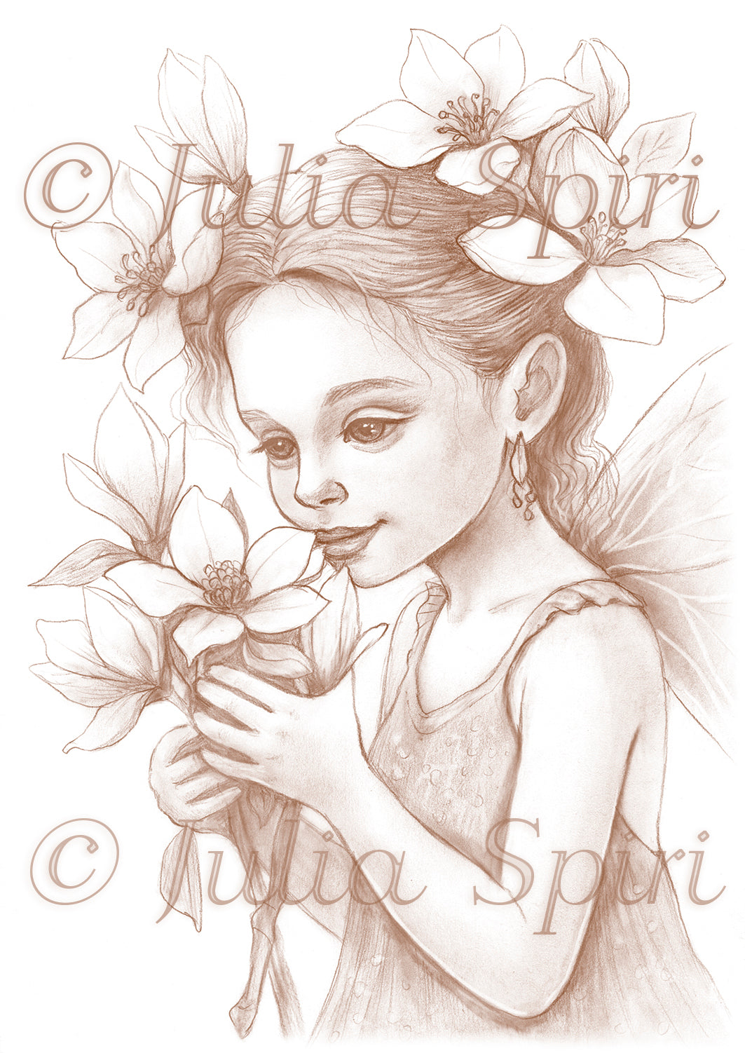 Grayscale Coloring Page. Whimsy Fairy Girl with Magnolias. Whispers of Magnolia