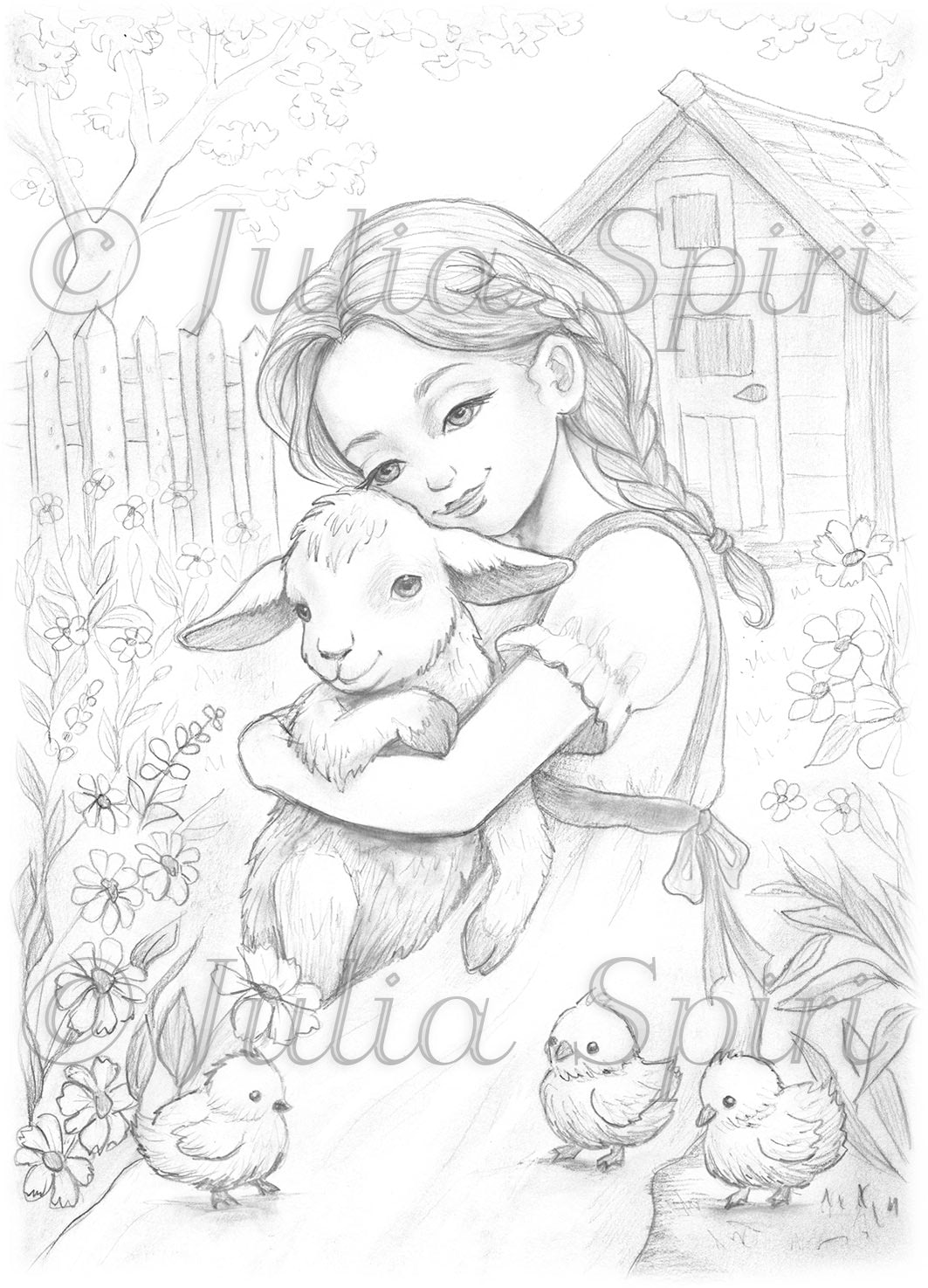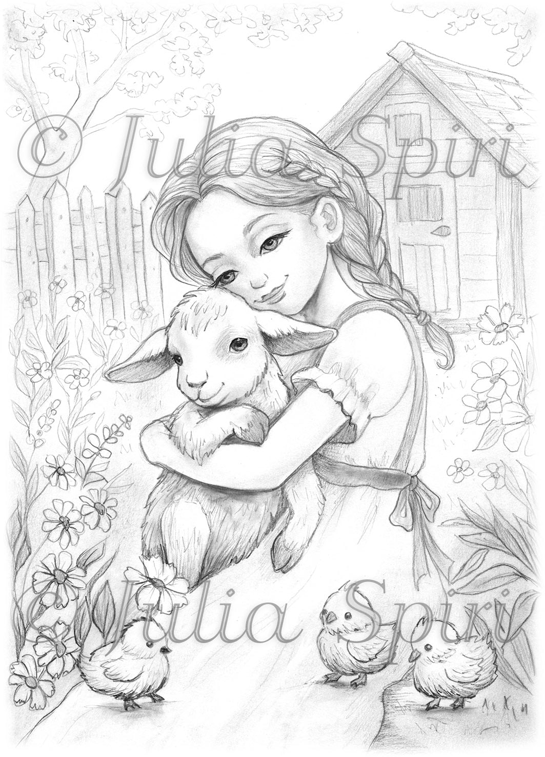 Grayscale Coloring Page, Girl with baby goat and chicks in garden. Heidi