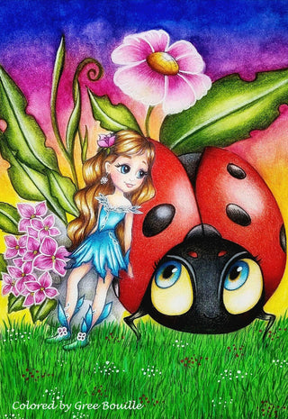 Coloring Page, Cute girl with Ladybug and Flowers. Thumbelina