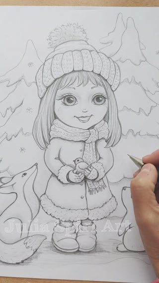 Coloring Page, Whimsy Cute Girl with folk and bunny. Winter walk