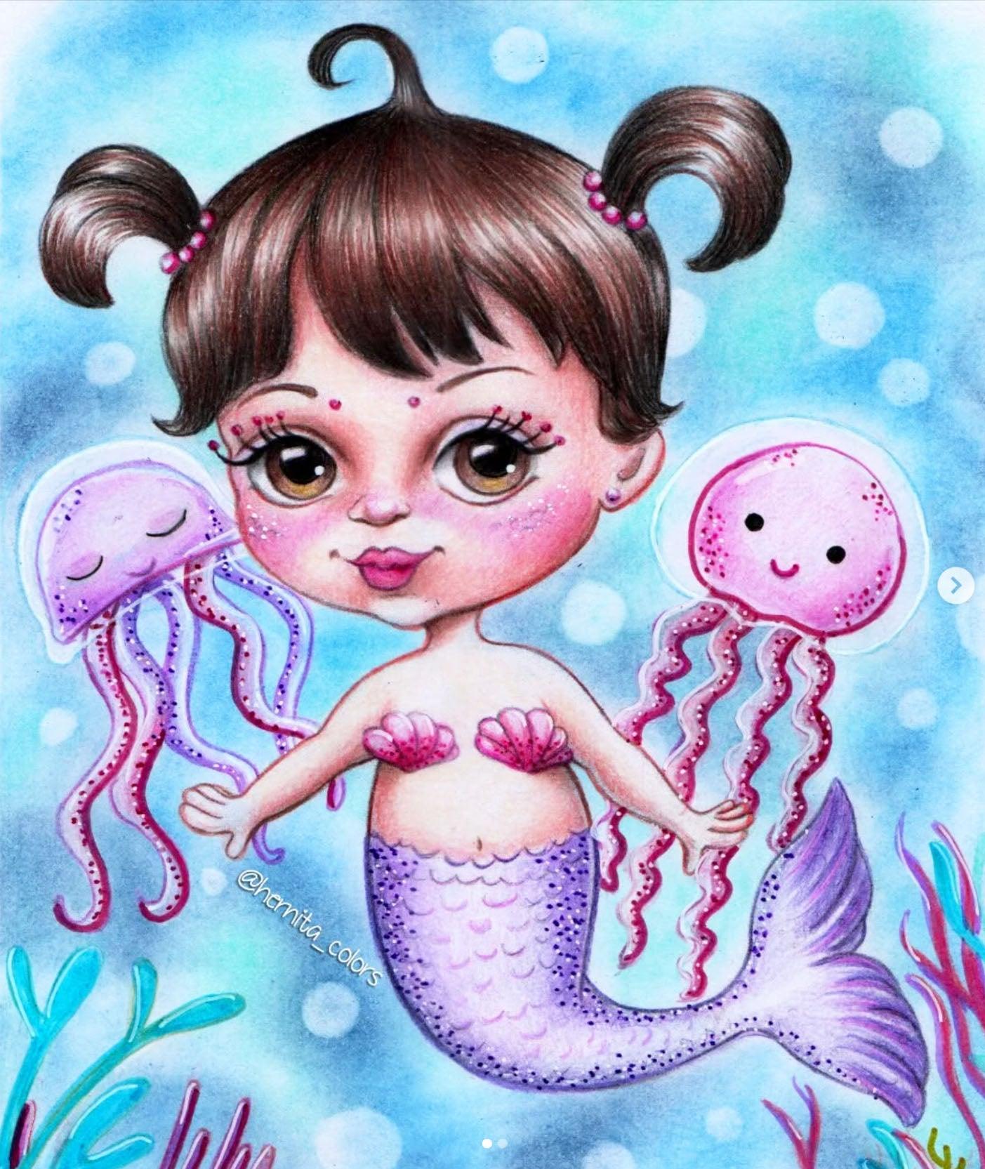 Páginas para colorear de sirenas, sello digital, mar, pescado, familia, madre, hija, bebé, fantasía, manualidades, tarjetas. bebe sirena