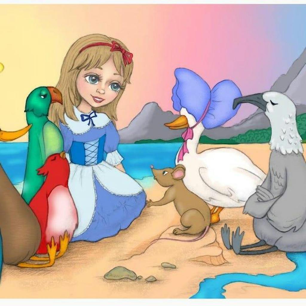 Coloriage, créatures d'Alice au pays des merveilles, canard, dodo, aiglon. Alice avec les oiseaux et la souris