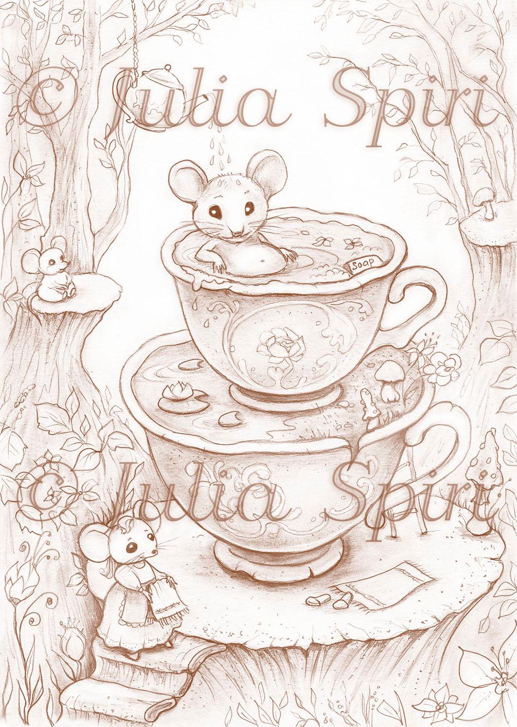 Page de coloriage en niveaux de gris, Des souris amusantes. Spa pour souris