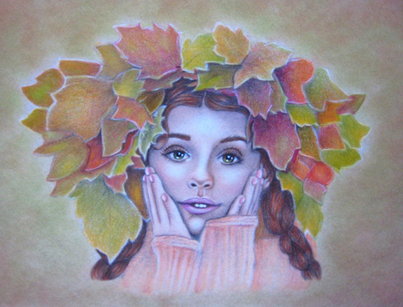 Page de coloriage en niveaux de gris, portrait de fille réaliste avec des feuilles. Automne