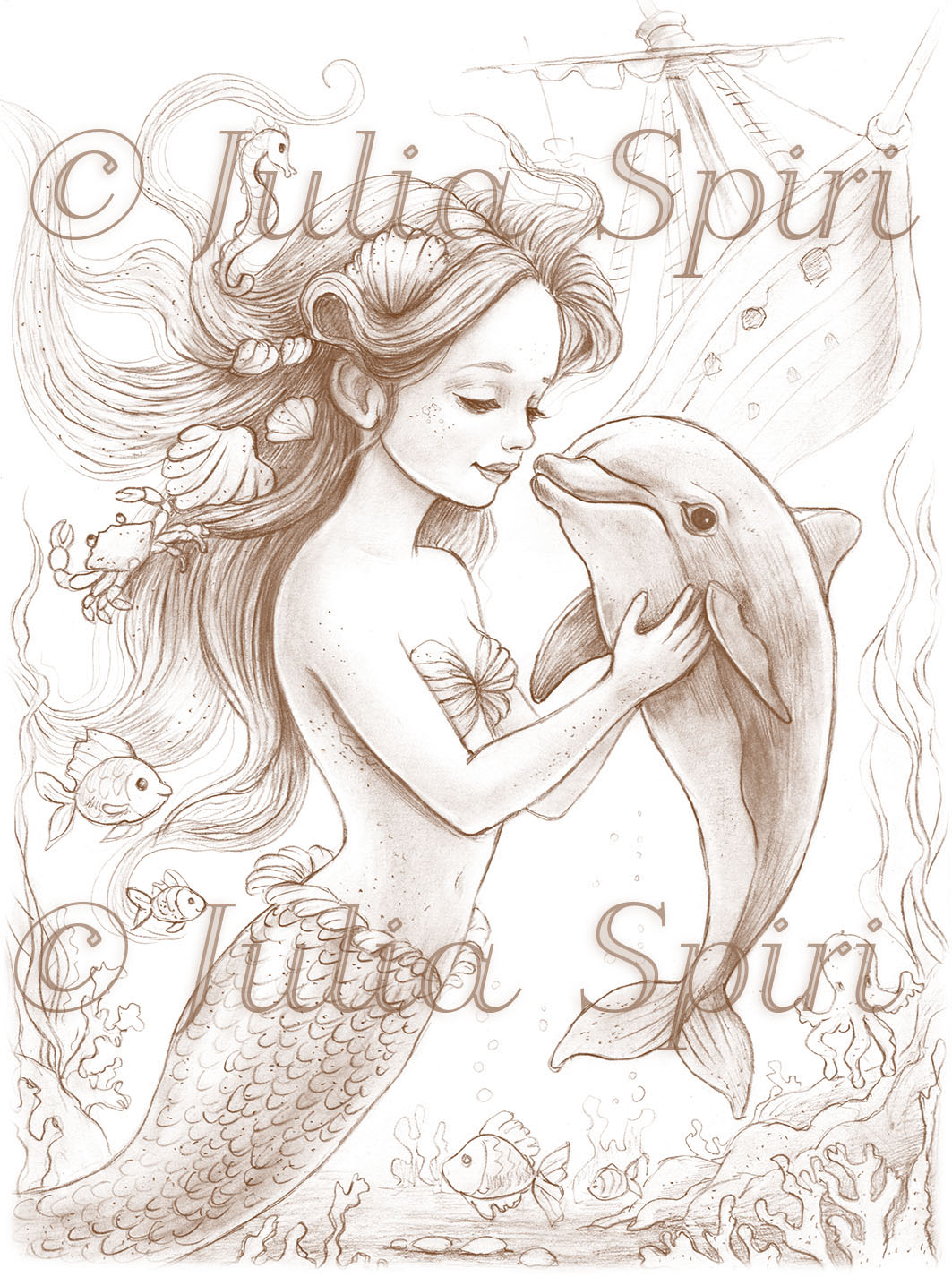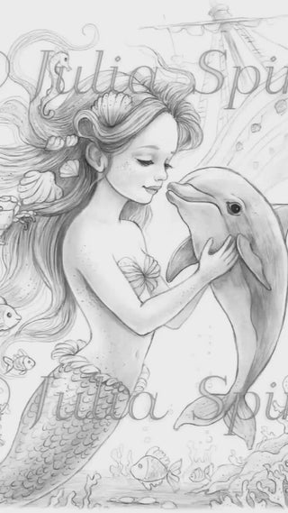 Grayscale Coloring Page, Mermaid Playing with Sea Creatures. The Mermaid’s Dolphin