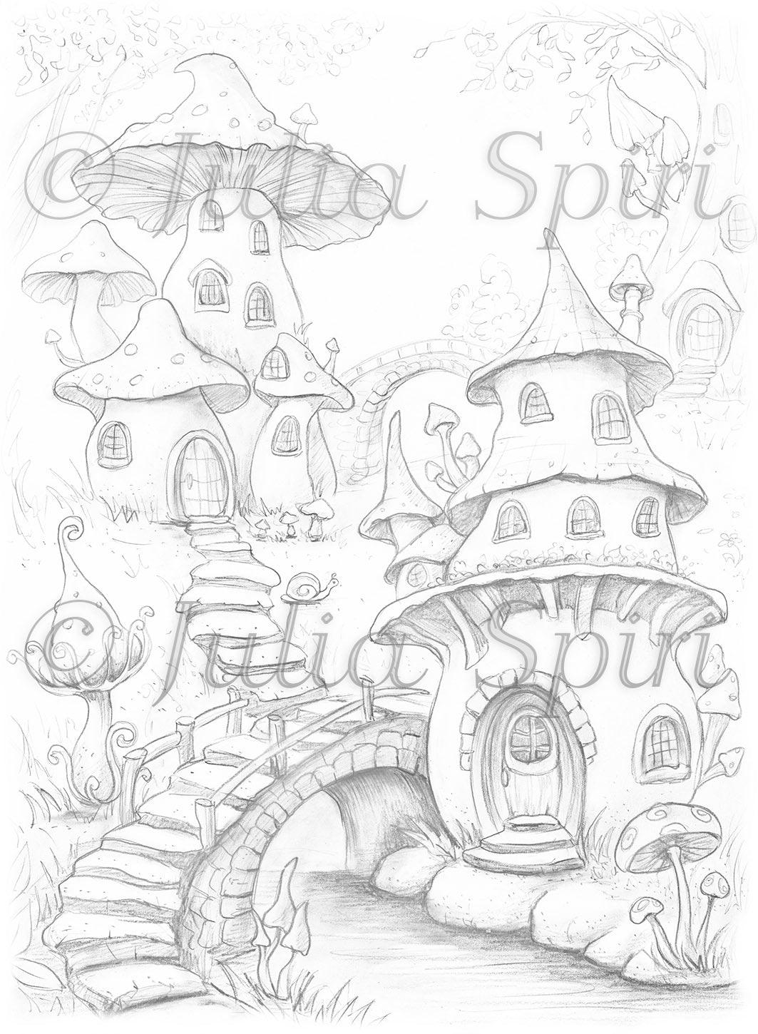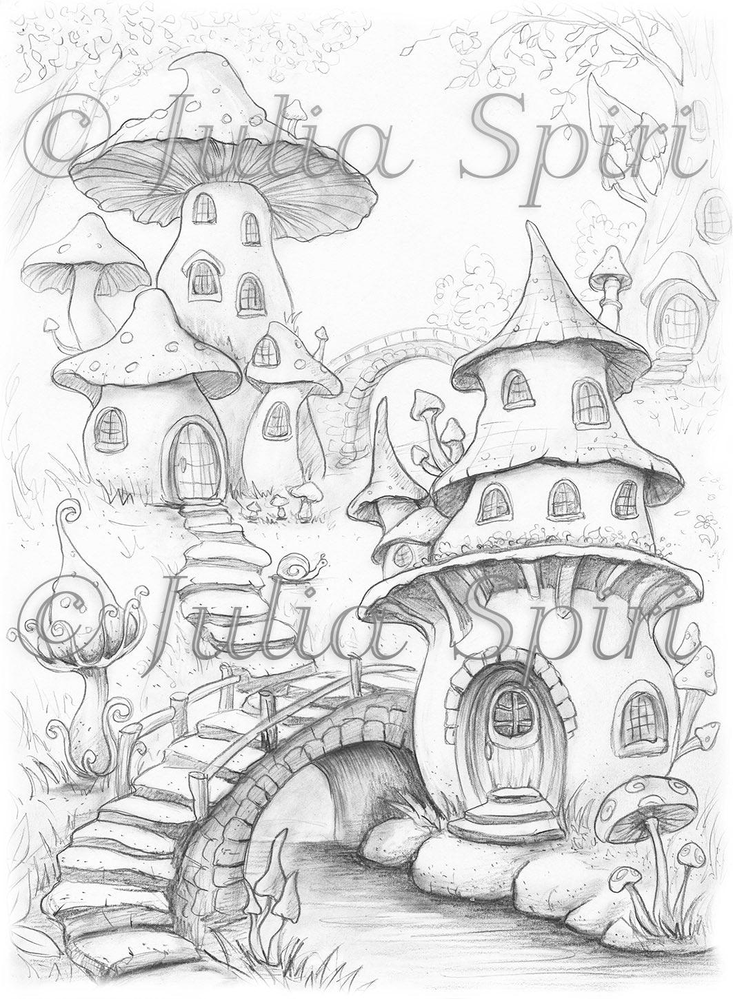 Grayscale Coloring Page, Fantasy Mushrooms. The Mushroom Village