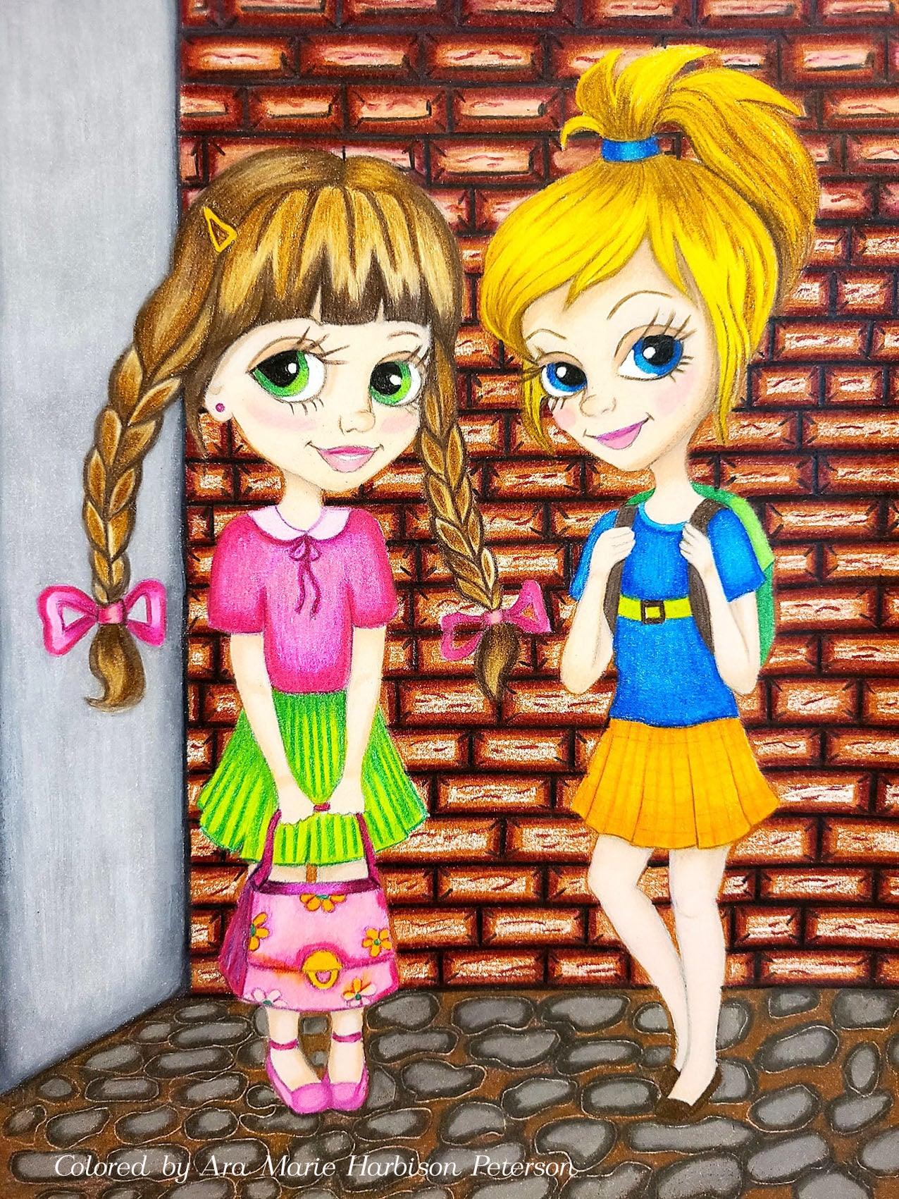 Page de coloriage, les filles retournent à l'école. Camarades d'école