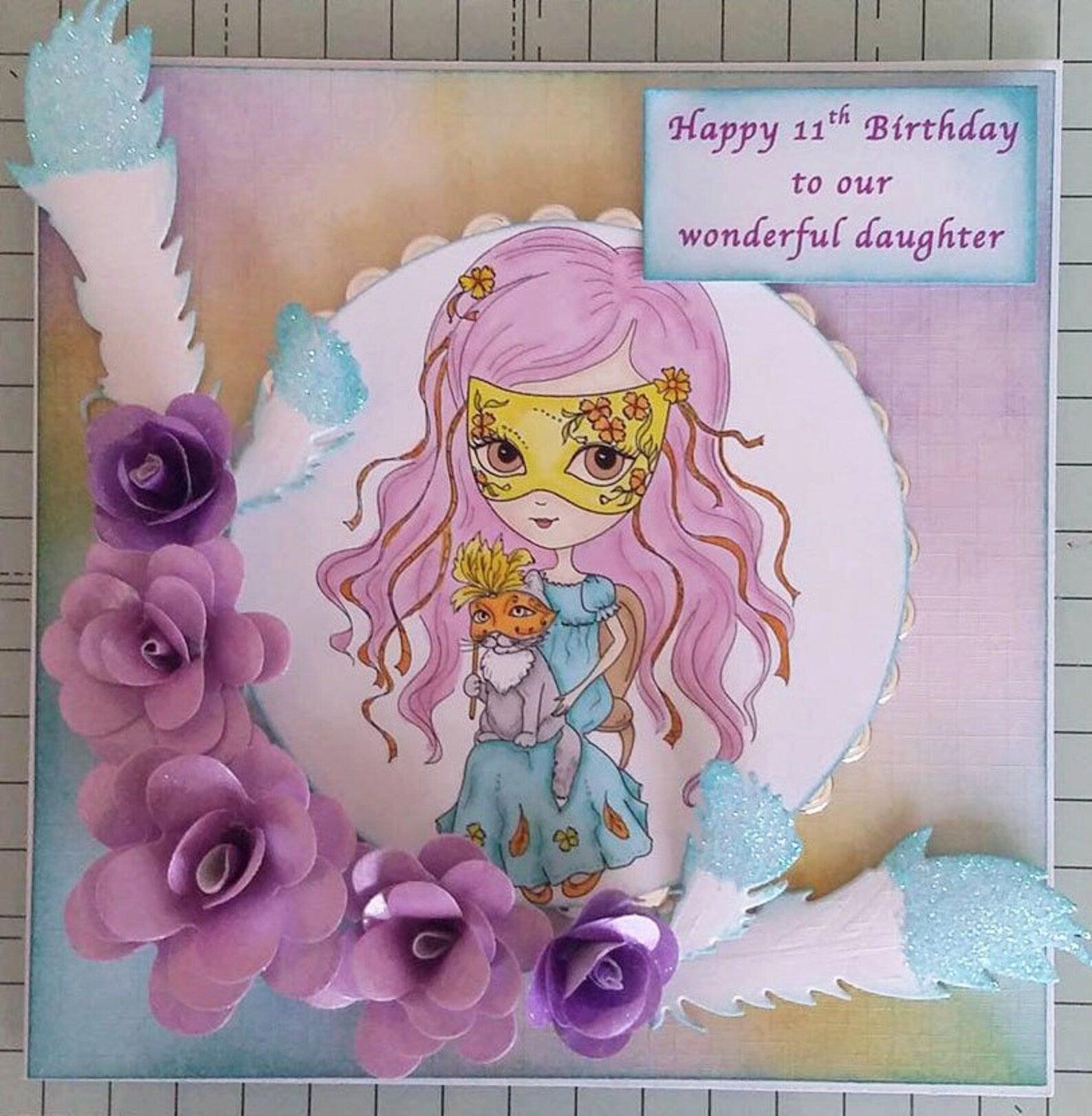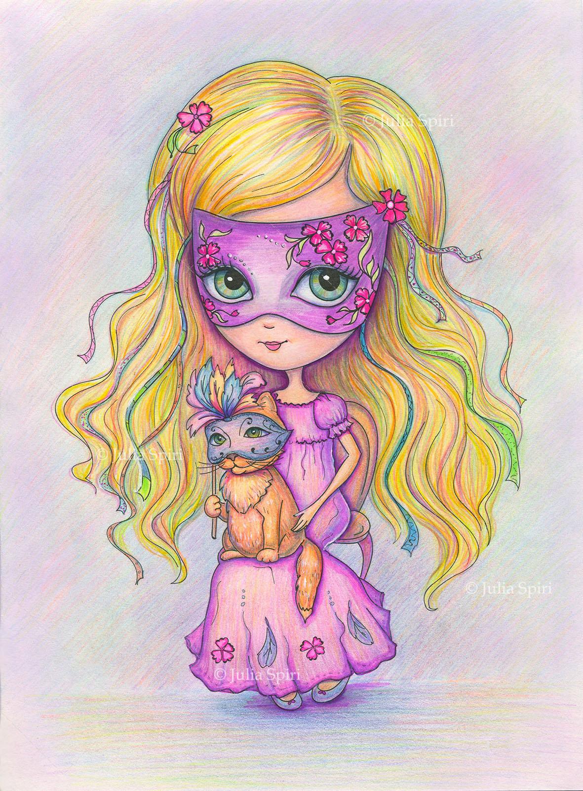 Coloring page, Whimsy Girl with Cat. The Venetian Girl